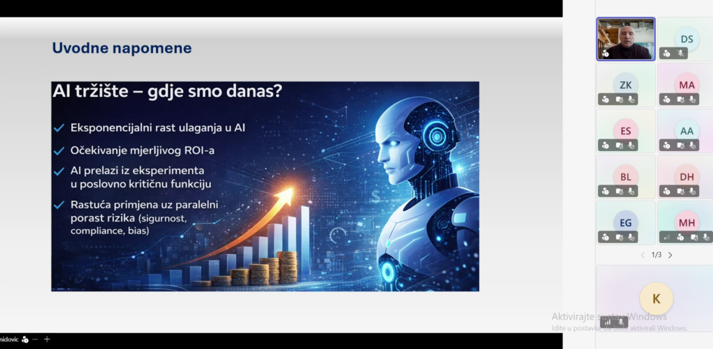 Webinar je vodio v. prof. dr. Haris Hamidovic (CISA, CISM, CCISO, CDPSE, ISO/IEC 27001 LA, ISO/IEC 27701 LA), predstavnik AMFI komisije za ITDigCS, član odbora ISACA Bosnia and Herzegovina Chapter i IEEE SSIT Distinguished Lecturer programa, CSO/CISO u MKF/MKD EKI Sarajevo, koji je kroz praktičan i strukturiran pristup predstavio ključne izazove i prilike koje AI donosi finansijskom sektoru.